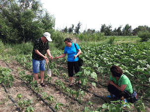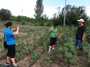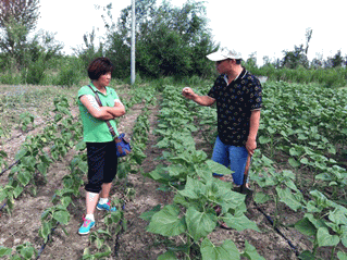 圖9:三位專家在地里察看 圖10:科技特派員認真聽取公司劉總講解列當?shù)奈:头乐未胧?/span>