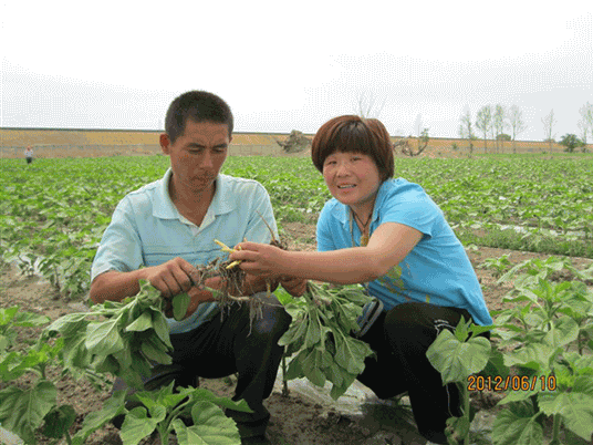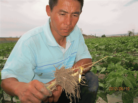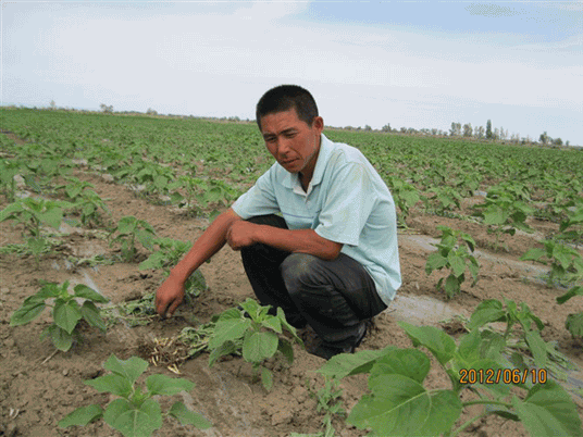 2012年,新疆阿勒泰地區(qū)科技特派員周琴視察“吉祥雨”復合微生物菌劑防治葵花列當圖
