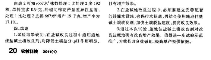 《農(nóng)村科技》2011年第1期 “施地佳”鹽堿土壤改良劑在棉花上的應(yīng)用效果試驗