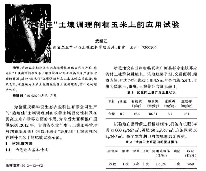 《新疆農(nóng)墾科技》2013年第3期 “施地佳”土壤調(diào)理劑在玉米上的應(yīng)用試驗(yàn)