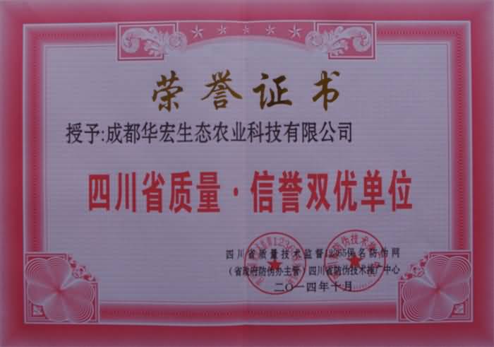 我公司獲四川省2014質量、信譽雙優(yōu)單位 2014/11/6 華宏生物 成都華宏生態(tài)農業(yè)科技有限公司 獲四川省2014質量、信譽雙優(yōu)單位 四川省質量技術監(jiān)督12365保名防偽網(wǎng)、(省政府防偽辦主管)四川省防偽技術推廣中心授予成都華宏生態(tài)農業(yè)科技有限公司“四川省質量、信譽雙優(yōu)單位”榮譽。