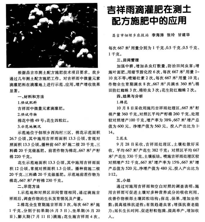 《農(nóng)村科技》2010年第4期 “吉祥雨”滴灌肥在測土配方施肥中的應用