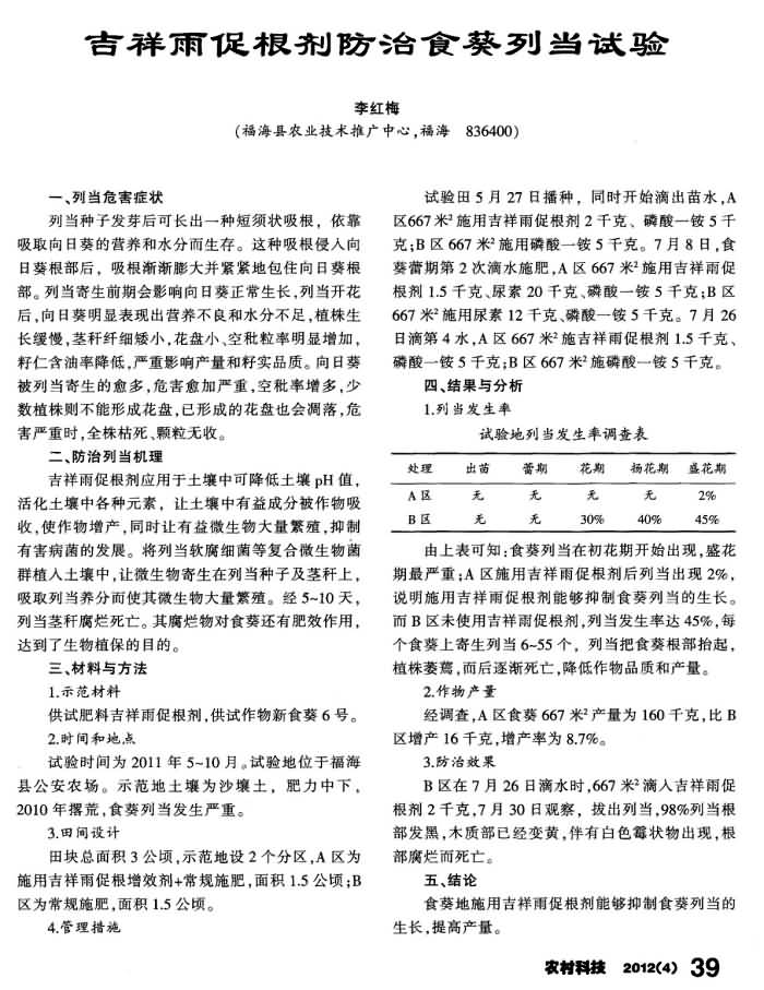 《農(nóng)村科技》2011年第4期 “吉祥雨”滴灌沖施促根劑防治食葵列當(dāng)試驗(yàn)