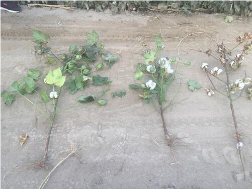 為了驗(yàn)證其在棉花上的抗病效果,華宏技術(shù)團(tuán)隊于2016年首次在該棉田進(jìn)行試驗(yàn),試驗(yàn)全部采用棉花膜下滴灌栽培技術(shù),從4月下旬播種期開始到9月取樣測產(chǎn),分別在試驗(yàn)區(qū)和對照區(qū)各選三個調(diào)查點(diǎn)進(jìn)行定點(diǎn)調(diào)查棉花長勢。試驗(yàn)發(fā)現(xiàn),施用“神鋤”的棉花在蕾期、花鈴期、鈴期、枯黃萎病病株均明顯低于未施“神鋤”的種植地,未施“神鋤”的對照區(qū)棉花在三個生育期發(fā)病率分別較施用“神鋤”的棉花增加89.4%、88.0%、84.9%,而且出現(xiàn)黃枯萎病的棉花以及整株干枯死亡的現(xiàn)象。